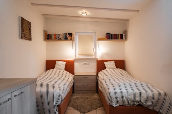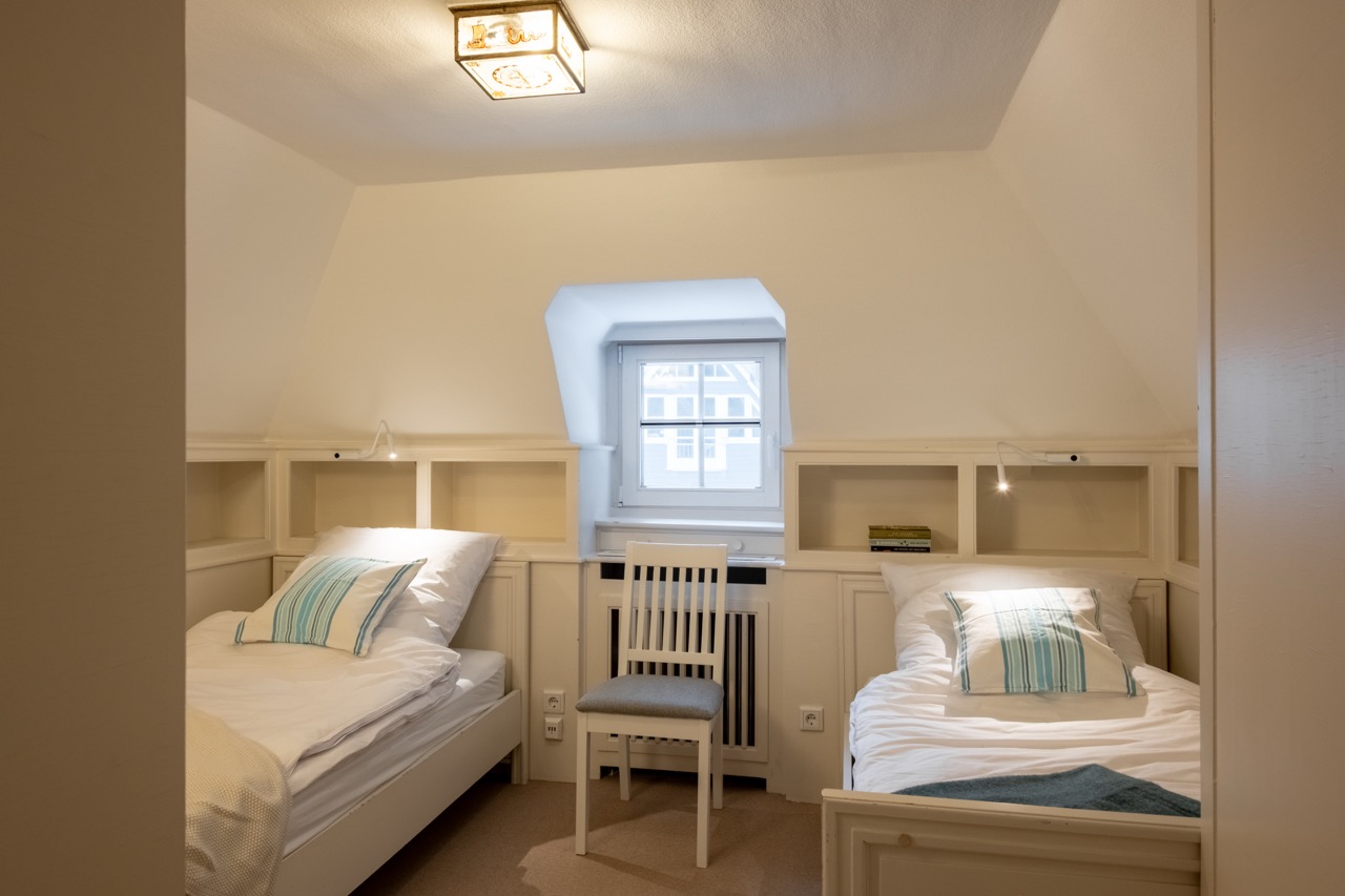Obergeschoss: Zwei gemütliche Zimmer mit Dachschrägen und jeweils zwei Einzelbetten, die man leicht zusammenschieben kann. Nostalgisches Extra: Jedes Zimmer verfügt über eine eigene Waschecke. Ein separates WC auf dieser Etage sorgt für kurze Wege in der Nacht.