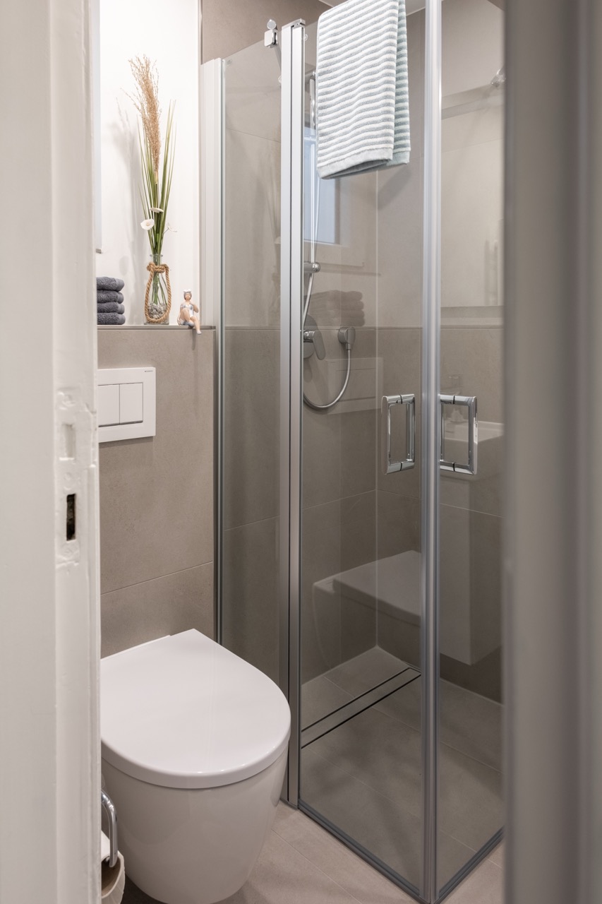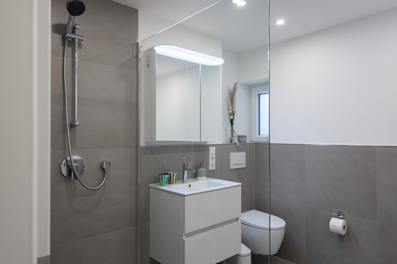 Wellness & Bad: Im Erdgeschoss erwarten Sie zwei brandneue Badezimmer (Baujahr 2026) mit Duschen. Waschmaschine und Trockner stehen Ihnen kostenlos zur Verfügung.