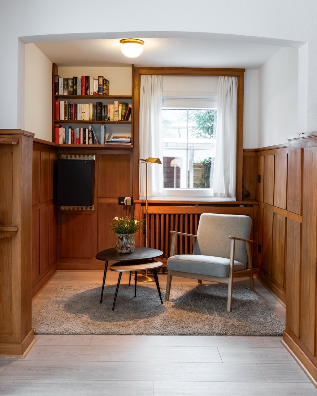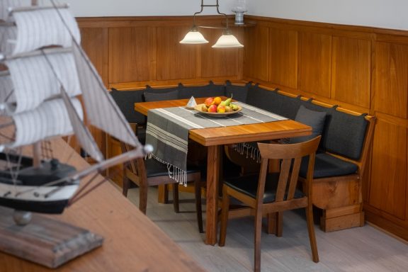 Wohnen & Genießen: Der lichtdurchflutete Wohn- und Essbereich atmet Geschichte. Alte Holzpaneele treffen auf eine gemütliche Eckbank, an der bis zu 8 Personen Platz finden. Ein separater Fernsehraum und eine Bücherecke bieten Rückzugsorte für jeden Geschmack.